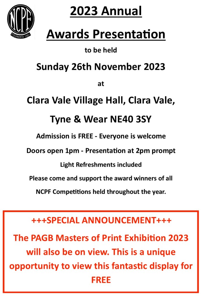 26th Oct 202328th Nov 2023 Northern Counties Photographic Federation 2023 Annual Awards Presentation Share this: Click to share on X (Opens in new window) X Click to share on Facebook (Opens in new window) Facebook Click to print (Opens in new window) Print Click to email a link to a friend (Opens in new window) Email