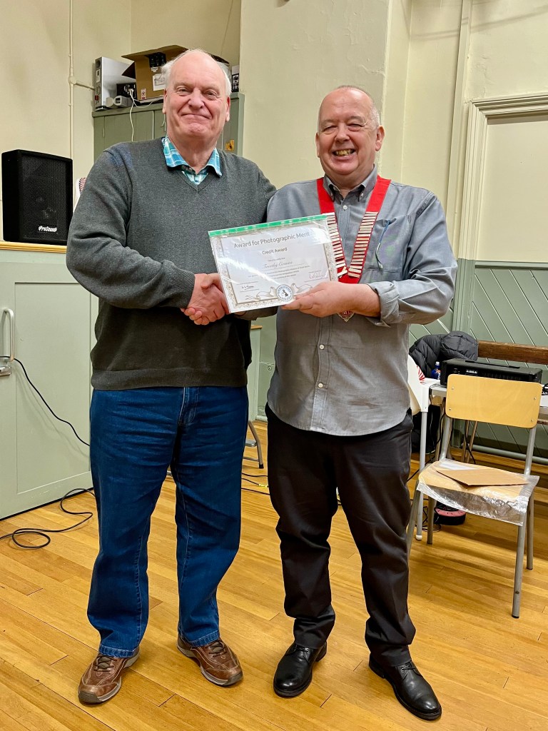 Alan also had the pleasure of presenting Tim Cossins with an Award for Photographic Merit for achieving the Credit Award of The Photographic Association of Great Britain. Well done Tim.