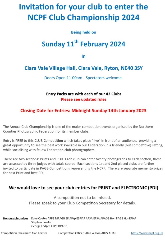 15th Dec 202314th Feb 2024 Northern Counties Photographic Federation NCPF Club Championship 2024 A Member Federation of the Photographic Alliance of Great Britain Share this: Click to share on X (Opens in new window) X Click to share on Facebook (Opens in new window) Facebook Click to print (Opens in new window) Print Click to email a link to a friend (Opens in new window) Email