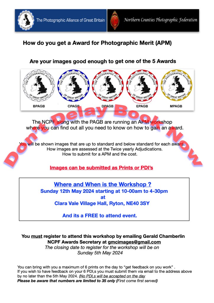 27th Mar 20245th May 2024 Northern Counties Photographic Federation APM Workshop Share this: Click to share on X (Opens in new window) X Click to share on Facebook (Opens in new window) Facebook Click to print (Opens in new window) Print Click to email a link to a friend (Opens in new window) Email