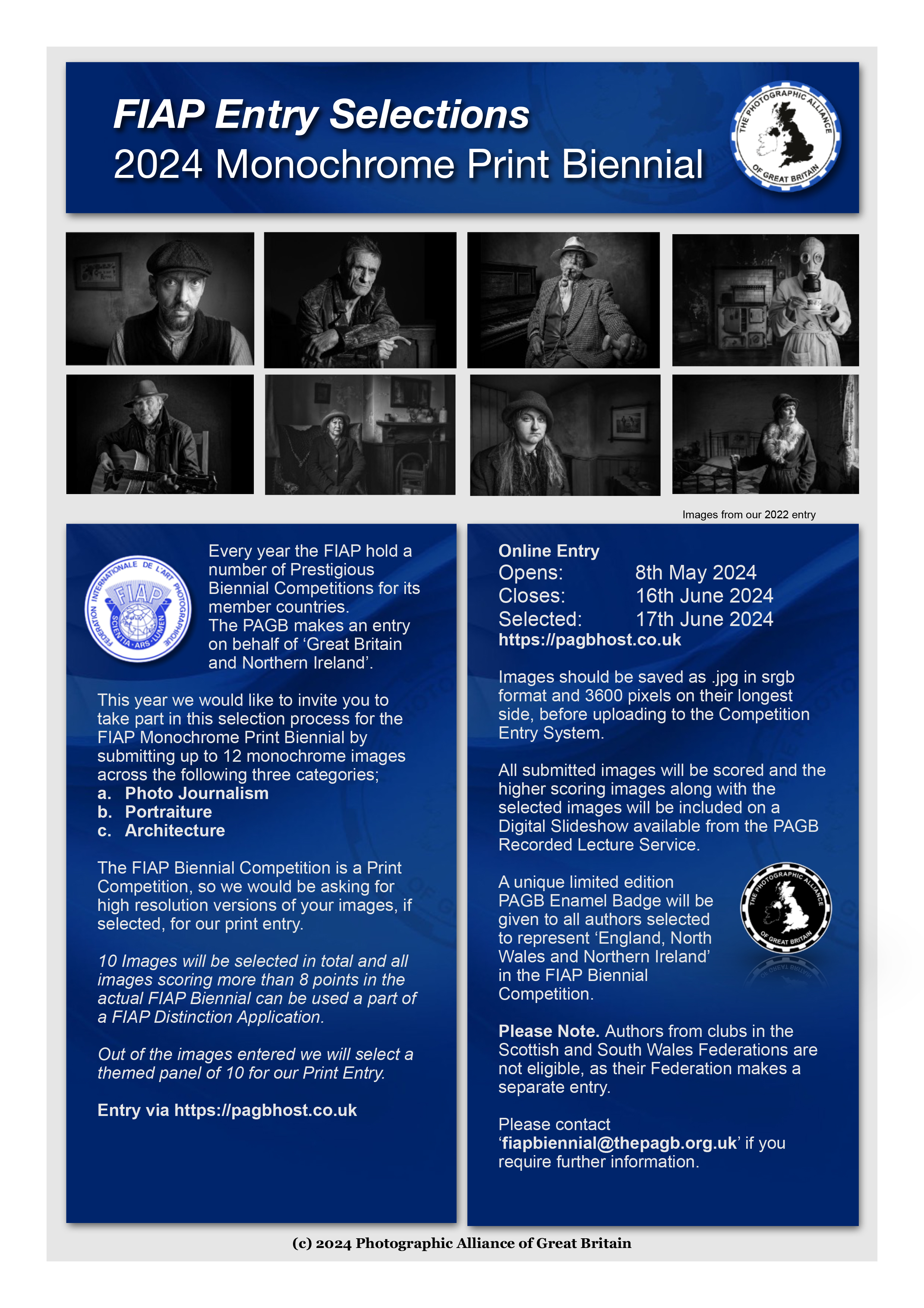 7th May 2024 Northern Counties Photographic Federation FIAP Monochrome Print Biennial 2024 Share this: Click to share on X (Opens in new window) X Click to share on Facebook (Opens in new window) Facebook Click to print (Opens in new window) Print Click to email a link to a friend (Opens in new window) Email