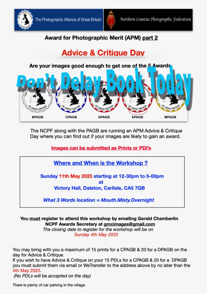 15th Apr 2025 Northern Counties Photographic Federation APM Advice & Critique Day Share this: Click to share on X (Opens in new window) X Click to share on Facebook (Opens in new window) Facebook Click to print (Opens in new window) Print Click to email a link to a friend (Opens in new window) Email