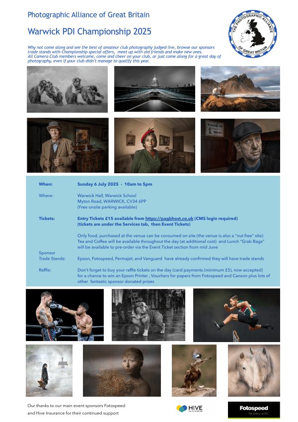30th May 202530th May 2025 Northern Counties Photographic Federation Warwick PDI Championship 2025 Please click on the image for a clearer view and to download the PDF flyer. Share this: Click to share on X (Opens in new window) X Click to share on Facebook (Opens in new window) Facebook Click to print (Opens in new window) Print Click to email a link to a friend (Opens in new window) Email